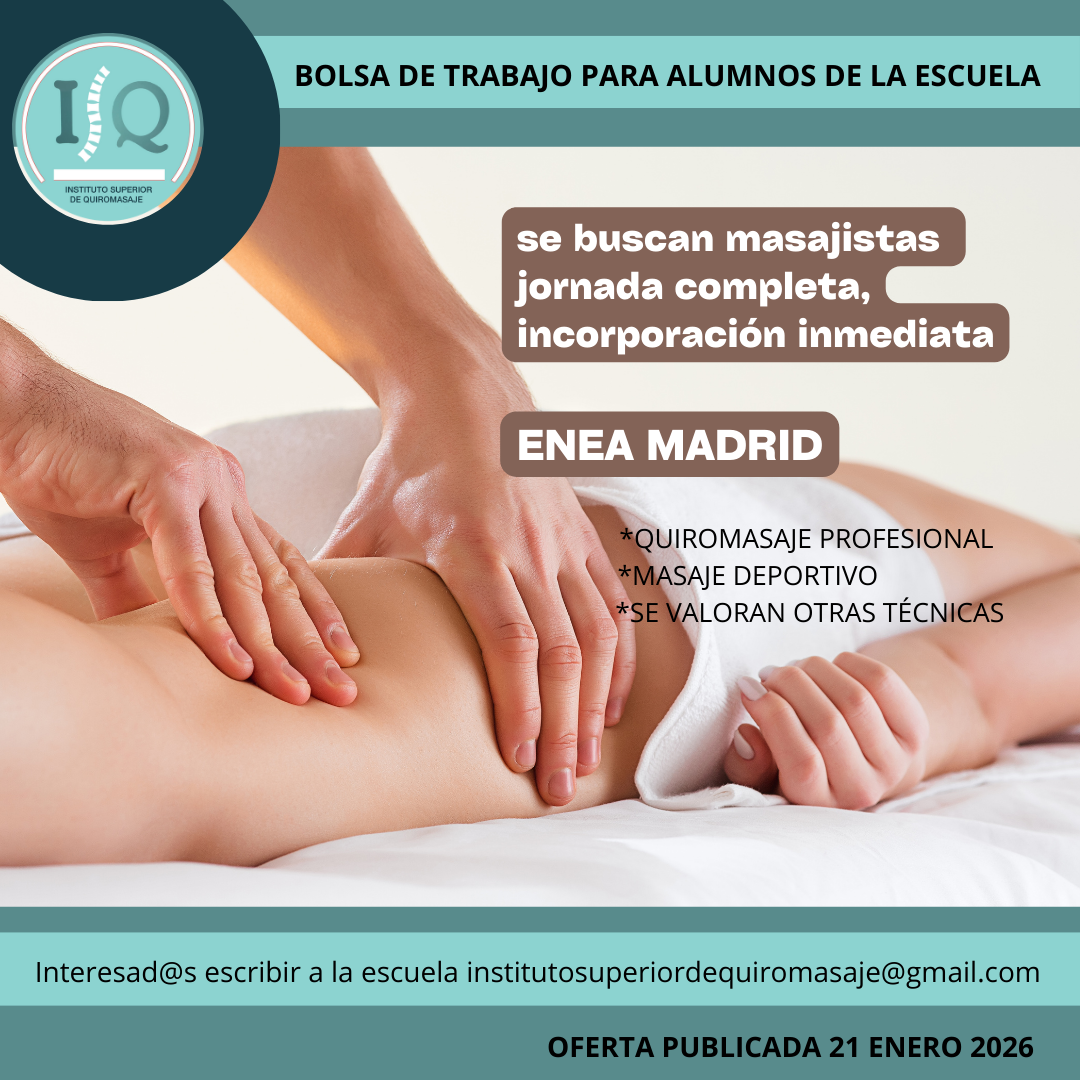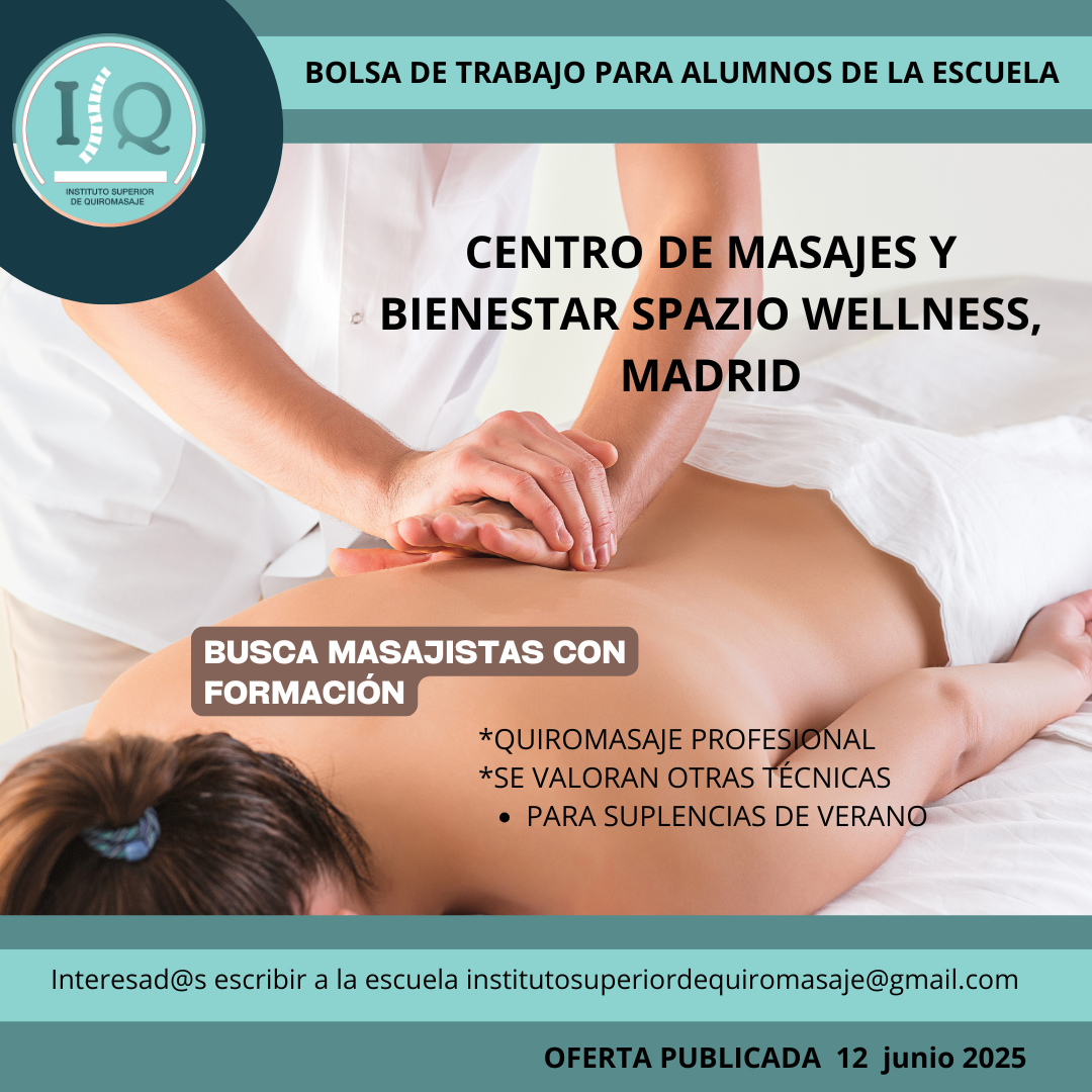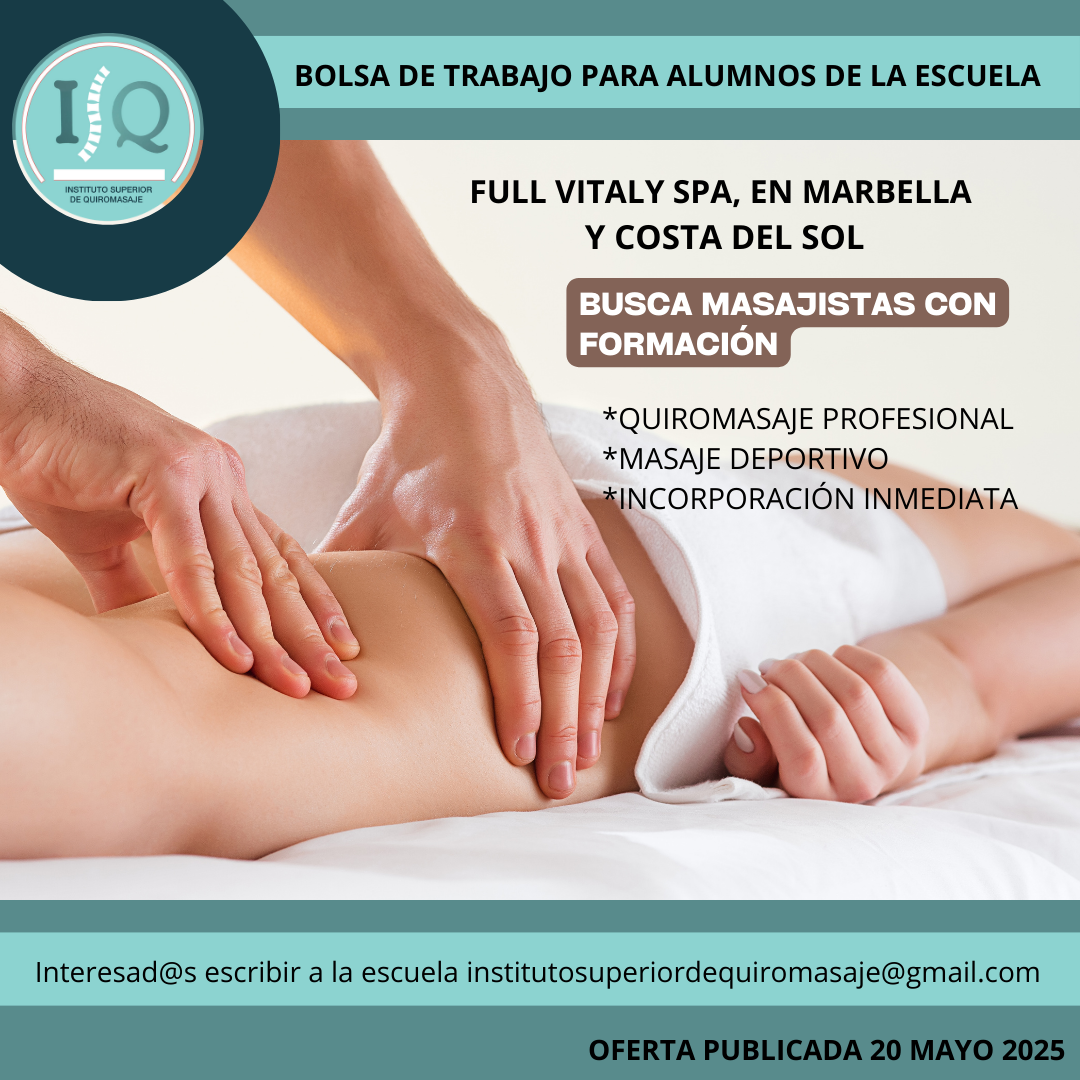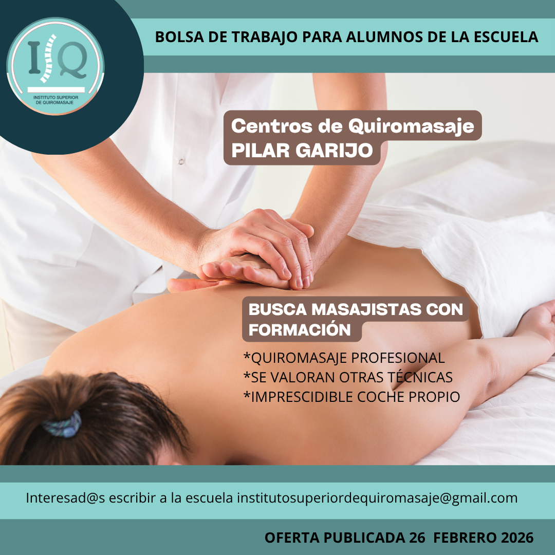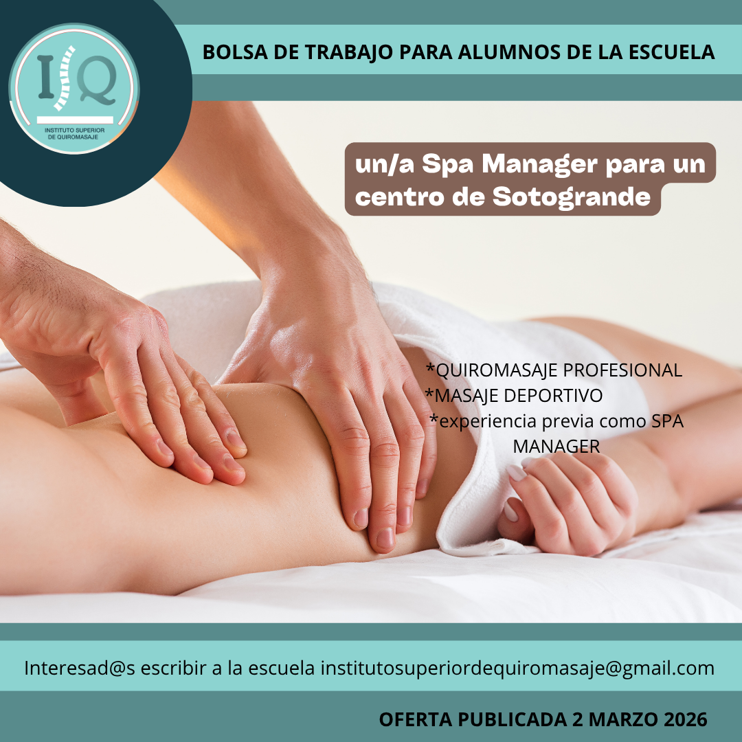 Porque en el Instituto Superior de Quiromasaje no nos quedamos solo en darte una formación profesional y de calidad, queremos que nuestros alumnos impartan lo aprendido a través de nuestra bolsa de empleo. Así, si has estudiado con nosotros, ¡estás de enhorabuena!, es muy posible que tu futuro empleo este entre nuestras ofertas. Echa un vistazo y no olvides comentar en la entrevista que vas de nuestra parte.