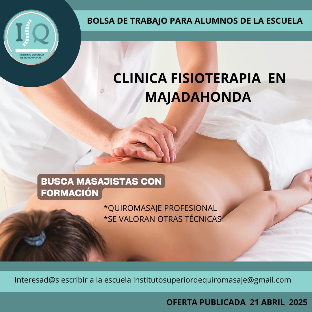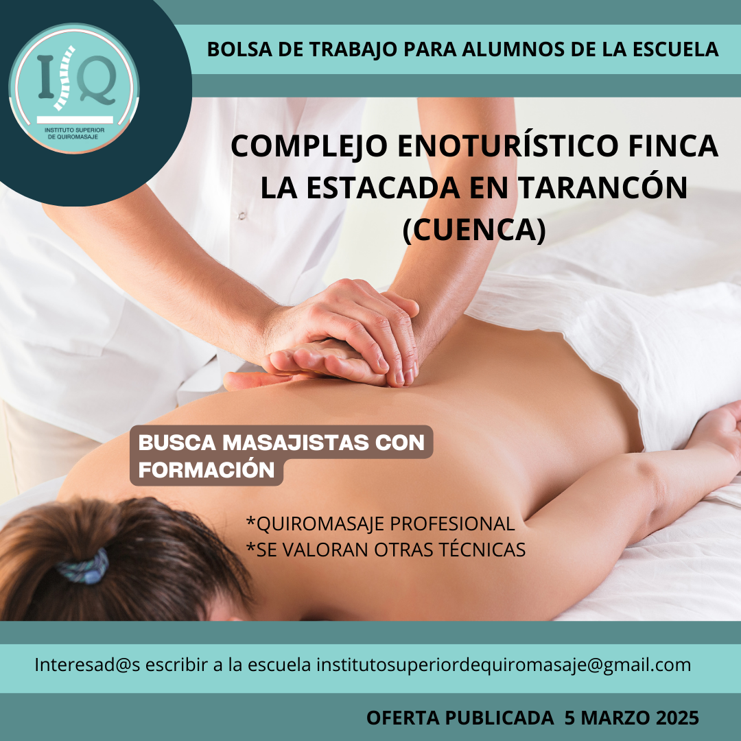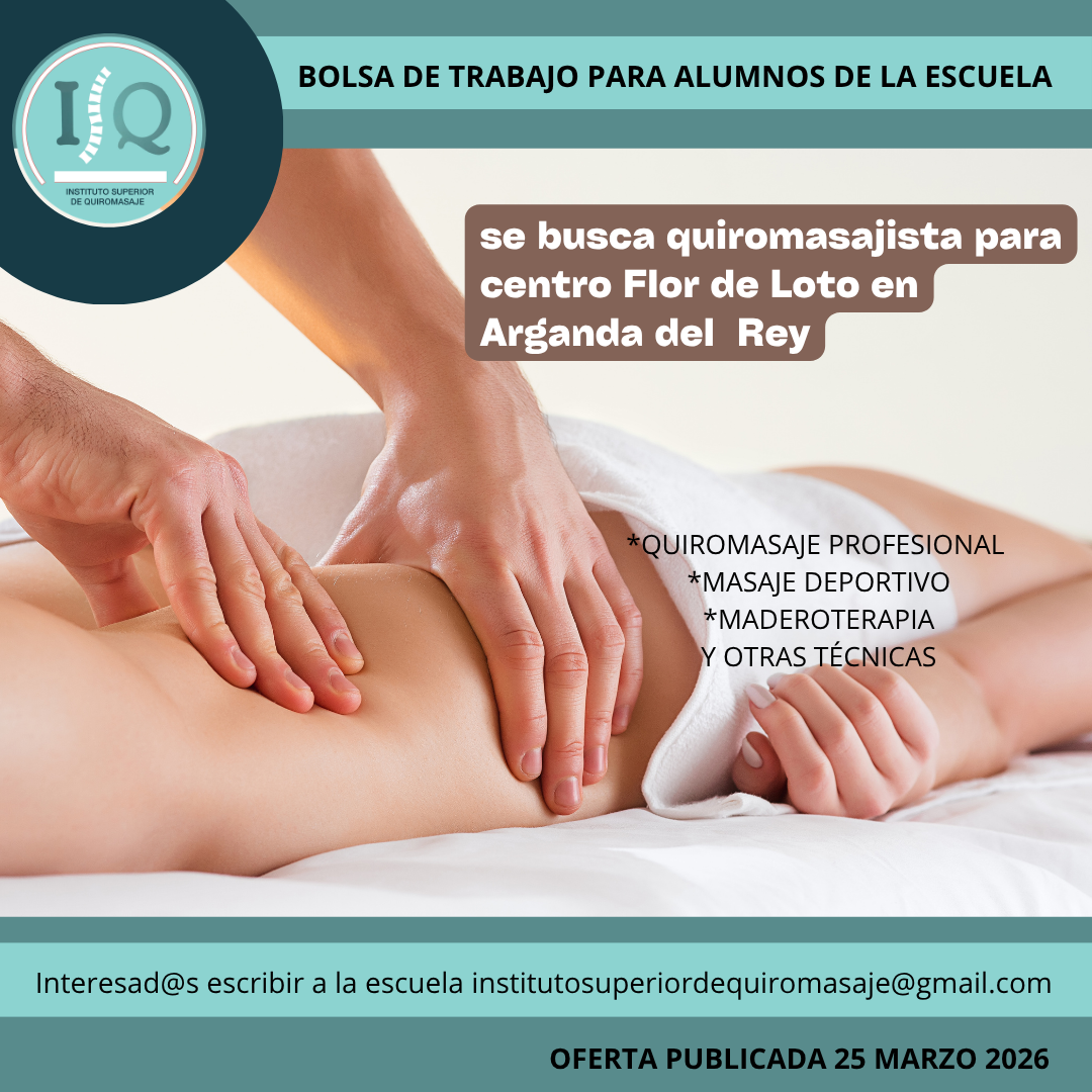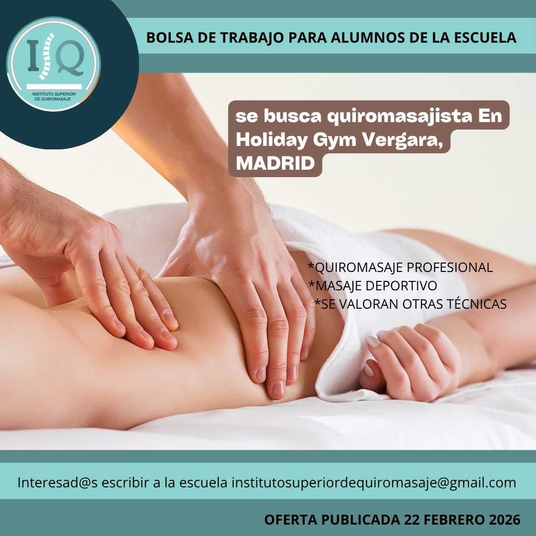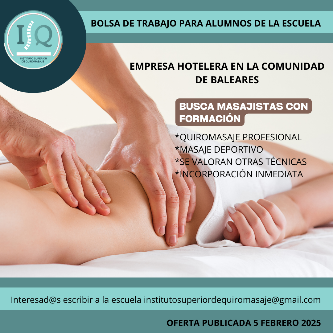 Porque en el Instituto Superior de Quiromasaje no nos quedamos solo en darte una formación profesional y de calidad, queremos que nuestros alumnos impartan lo aprendido a través de nuestra bolsa de empleo. Así, si has estudiado con nosotros, ¡estás de enhorabuena!, es muy posible que tu futuro empleo este entre nuestras ofertas. Echa un vistazo y no olvides comentar en la entrevista que vas de nuestra parte.