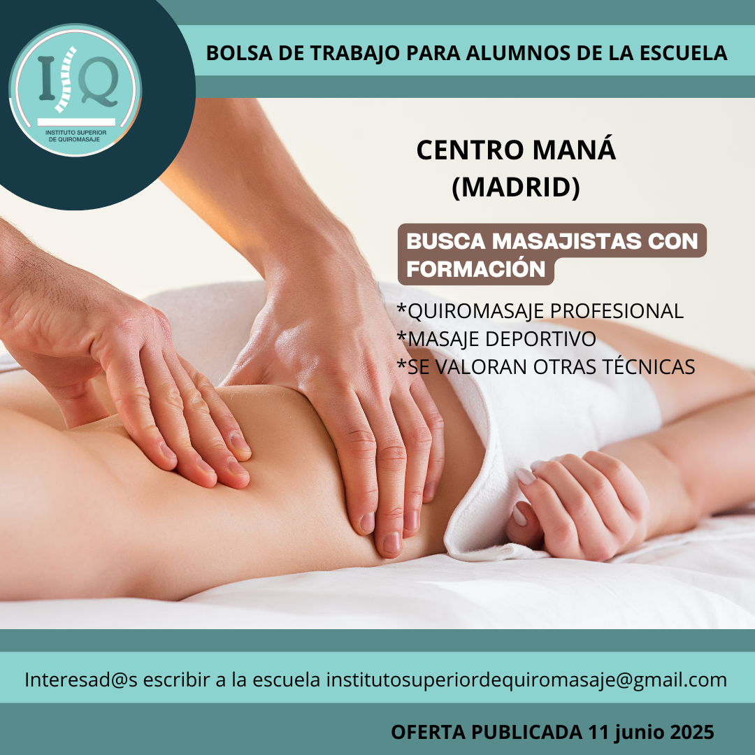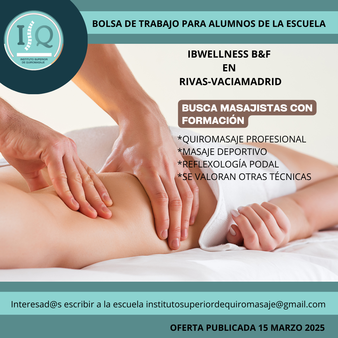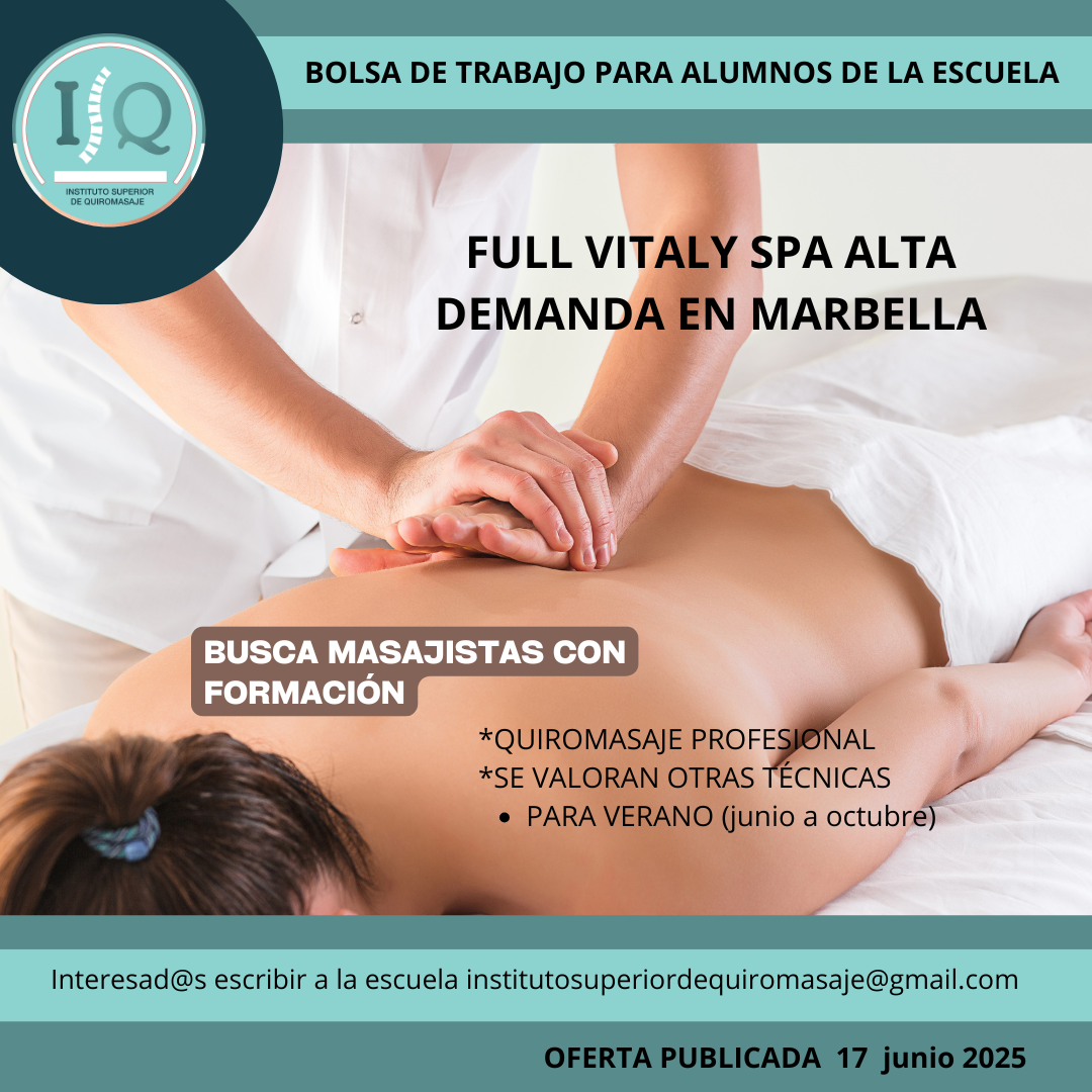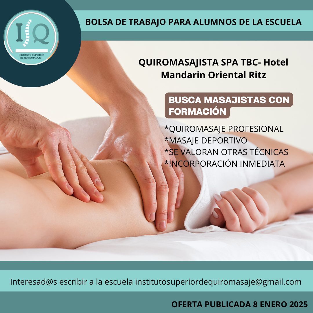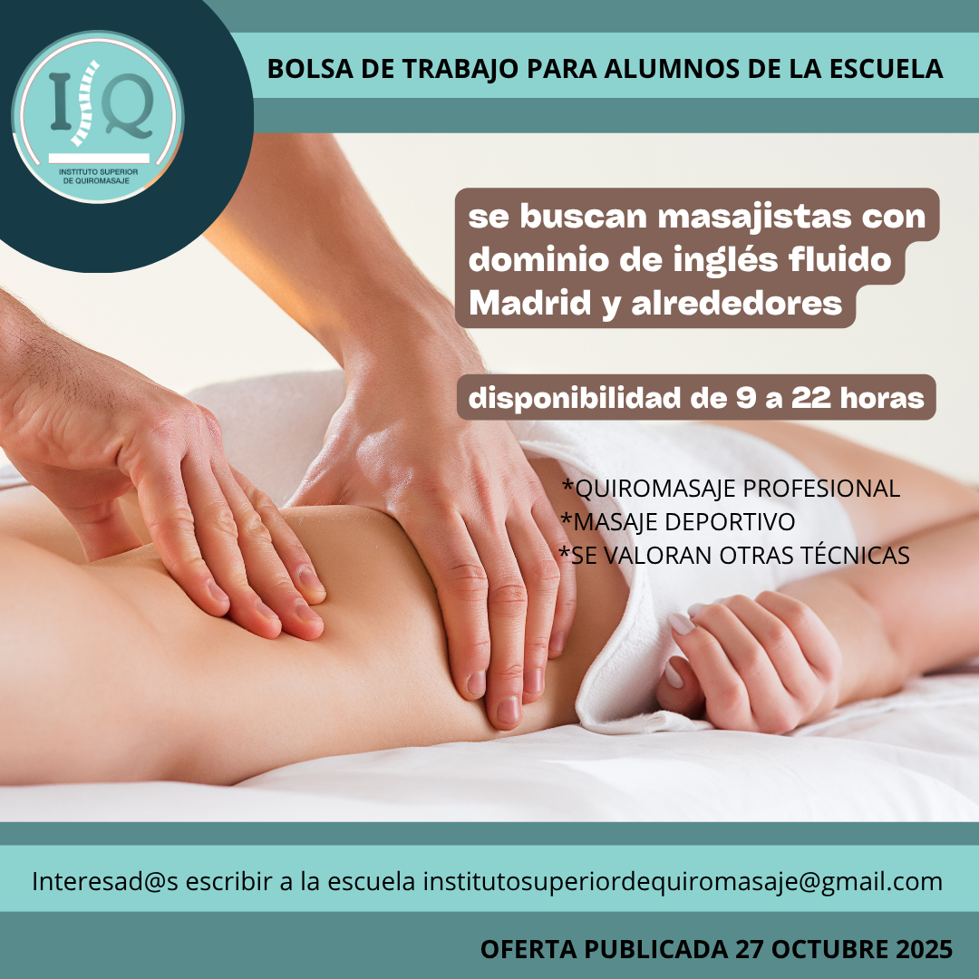 Porque en el Instituto Superior de Quiromasaje no nos quedamos solo en darte una formación profesional y de calidad, queremos que nuestros alumnos impartan lo aprendido a través de nuestra bolsa de empleo. Así, si has estudiado con nosotros, ¡estás de enhorabuena!, es muy posible que tu futuro empleo este entre nuestras ofertas. Echa un vistazo y no olvides comentar en la entrevista que vas de nuestra parte.