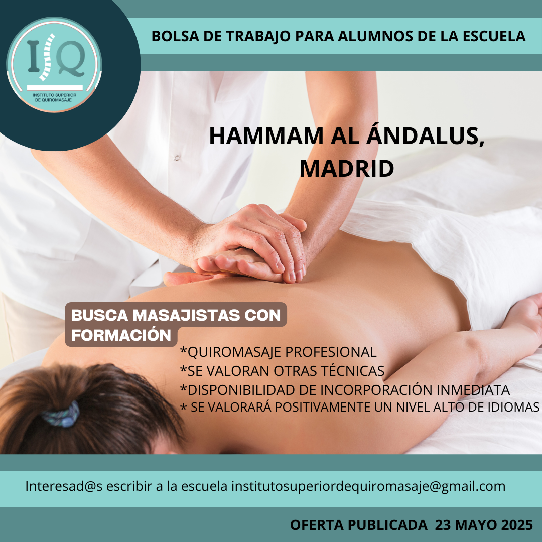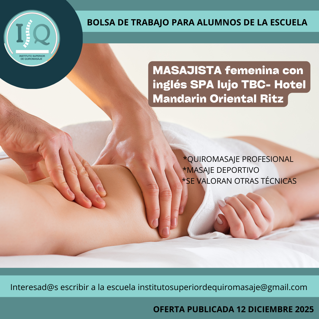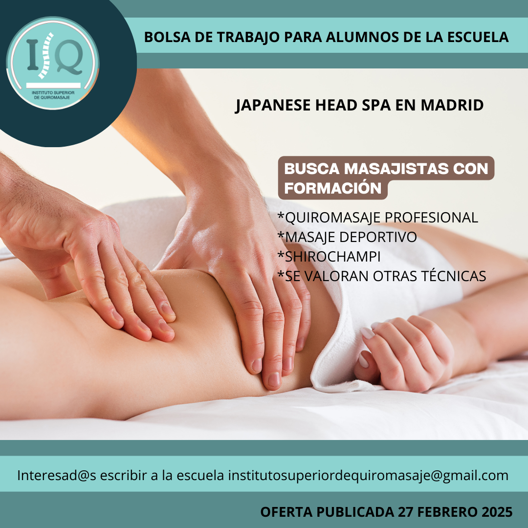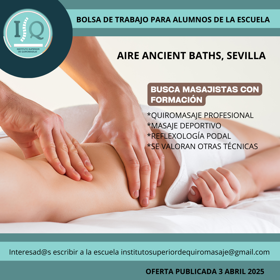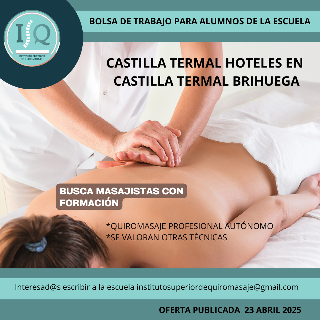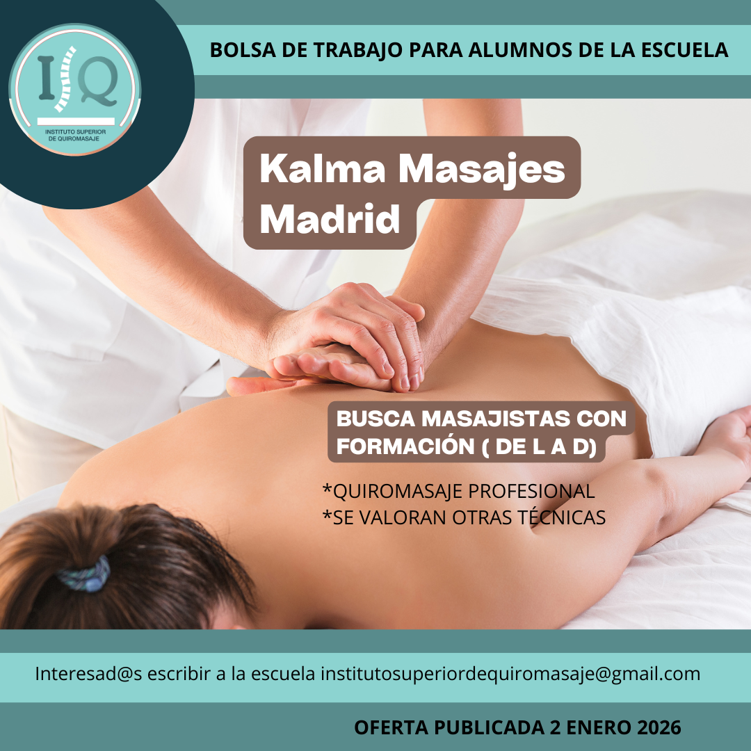 Porque en el Instituto Superior de Quiromasaje no nos quedamos solo en darte una formación profesional y de calidad, queremos que nuestros alumnos impartan lo aprendido a través de nuestra bolsa de empleo. Así, si has estudiado con nosotros, ¡estás de enhorabuena!, es muy posible que tu futuro empleo este entre nuestras ofertas. Echa un vistazo y no olvides comentar en la entrevista que vas de nuestra parte.