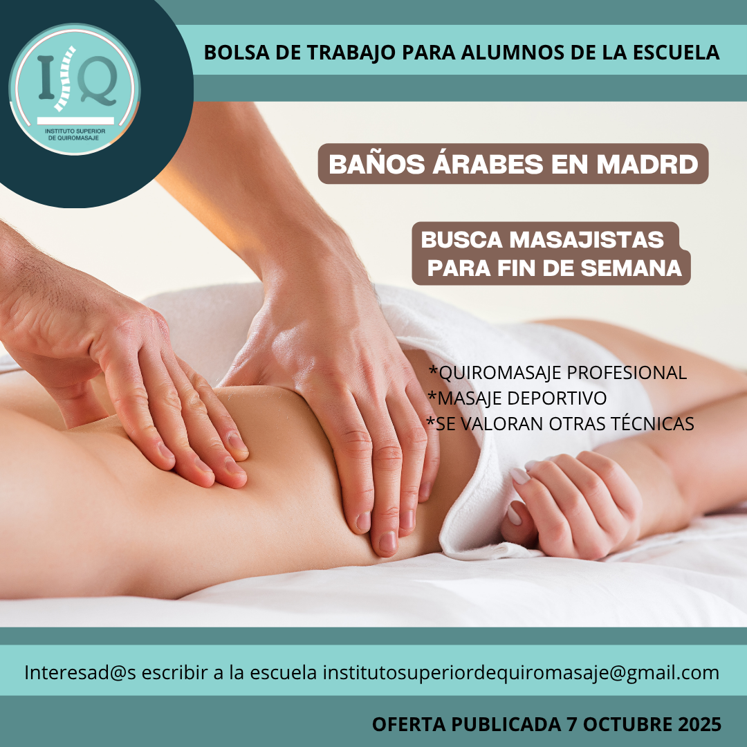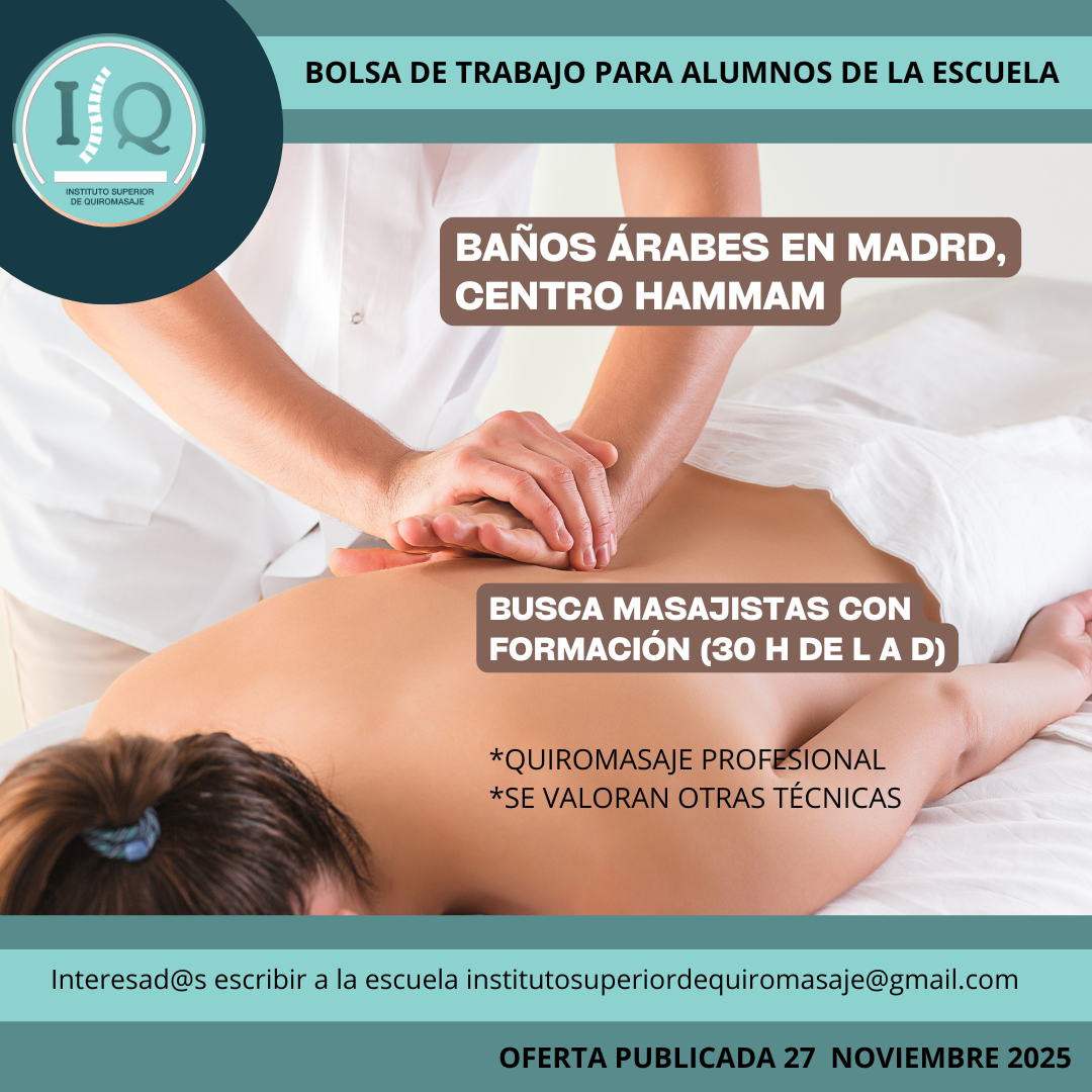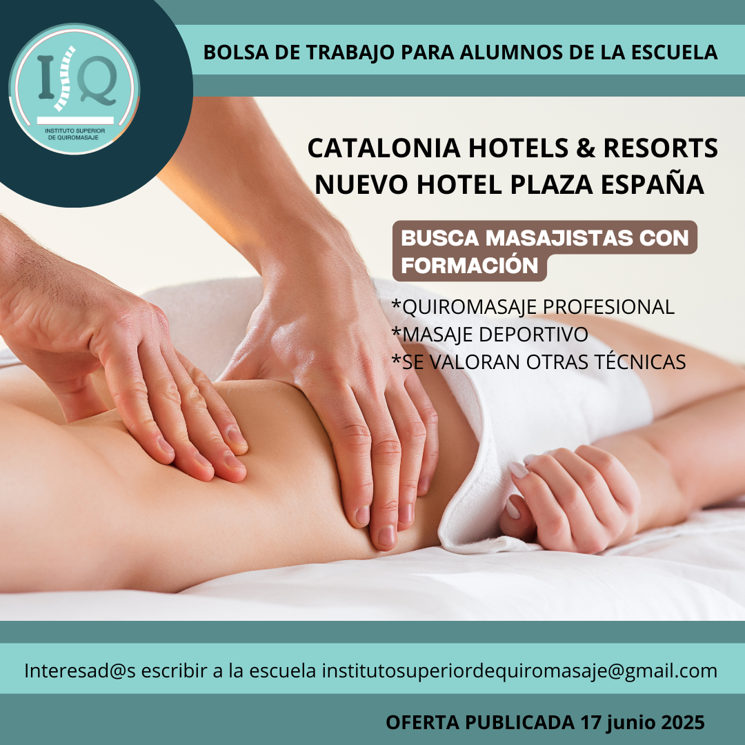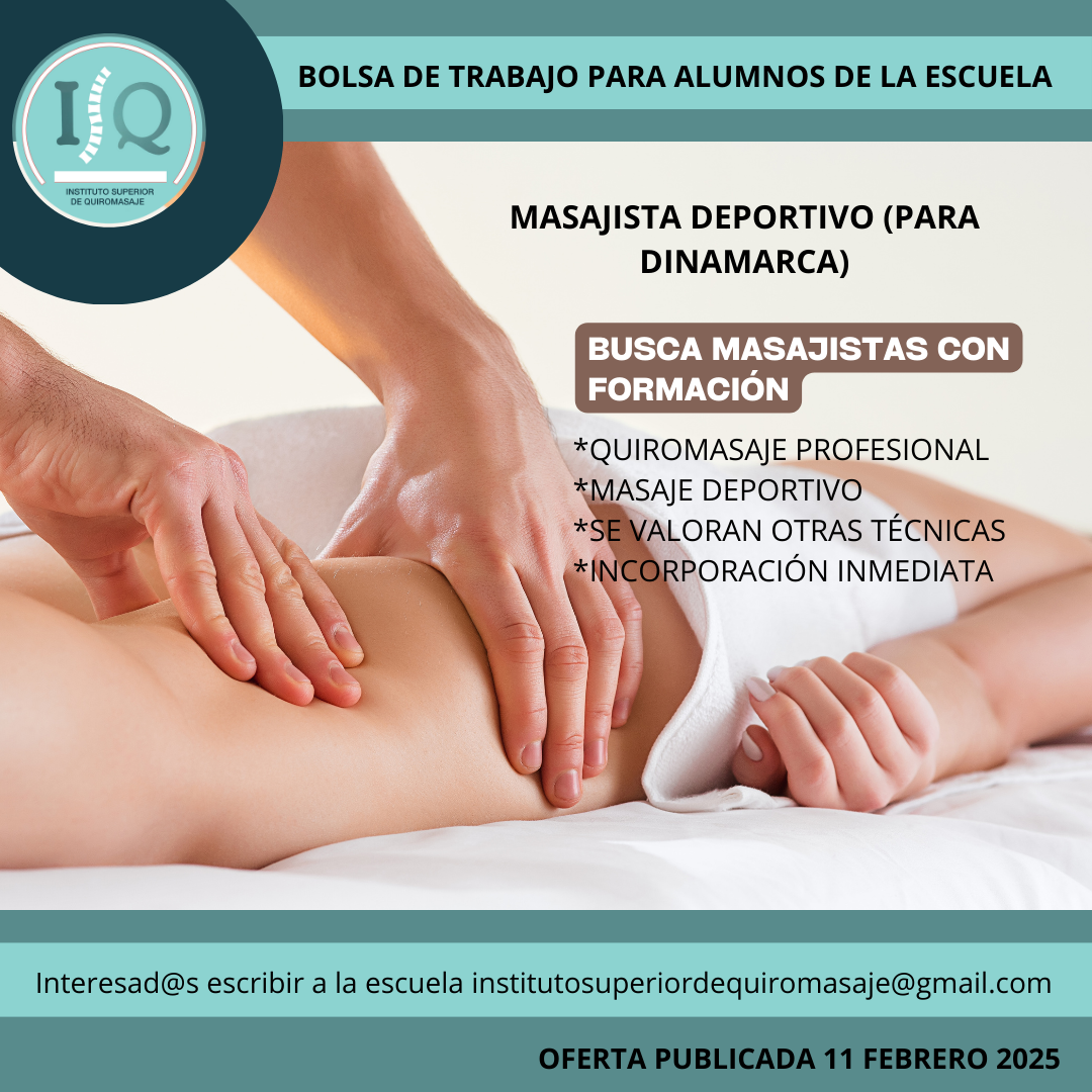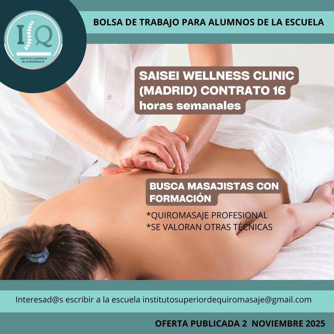 Porque en el Instituto Superior de Quiromasaje no nos quedamos solo en darte una formación profesional y de calidad, queremos que nuestros alumnos impartan lo aprendido a través de nuestra bolsa de empleo. Así, si has estudiado con nosotros, ¡estás de enhorabuena!, es muy posible que tu futuro empleo este entre nuestras ofertas. Echa un vistazo y no olvides comentar en la entrevista que vas de nuestra parte.