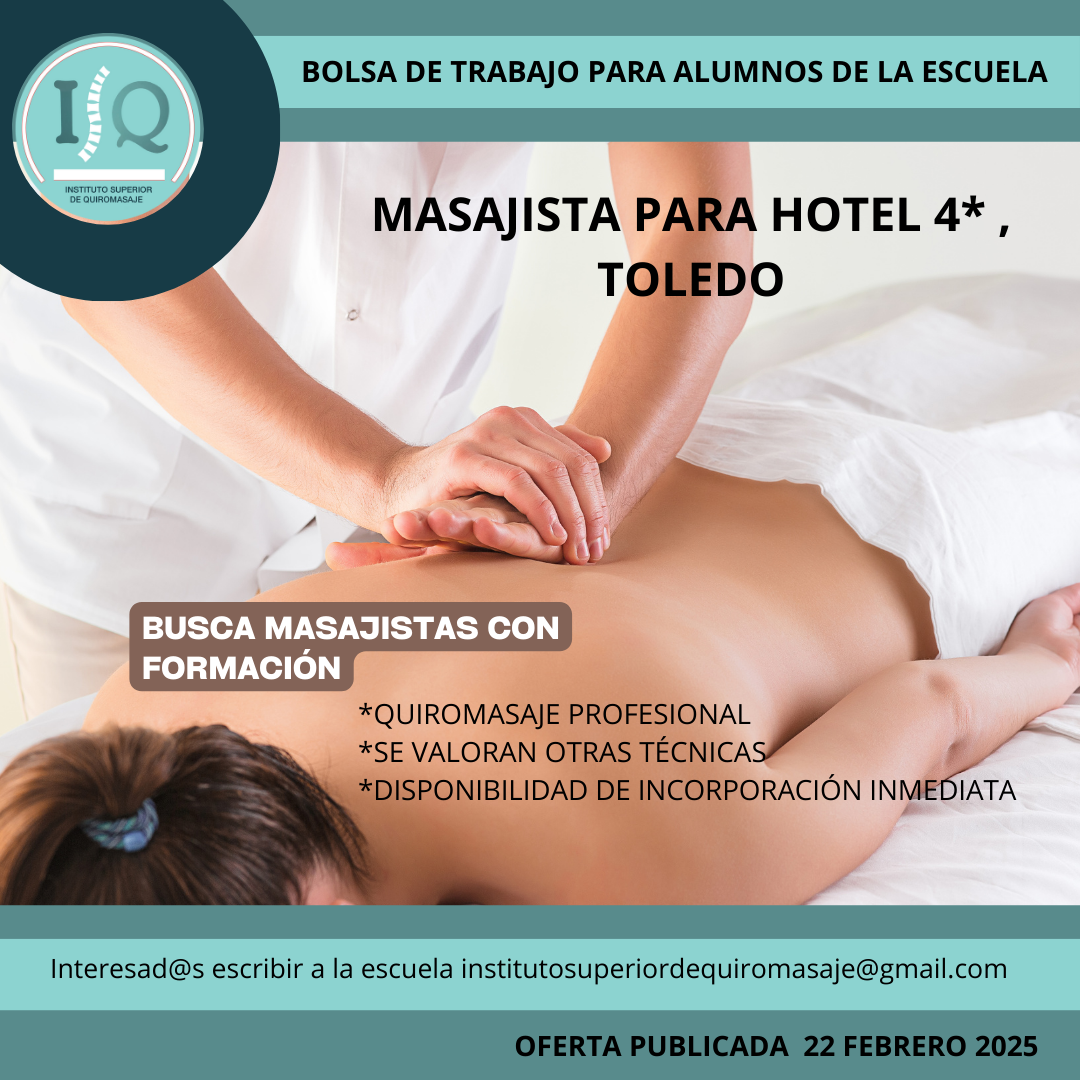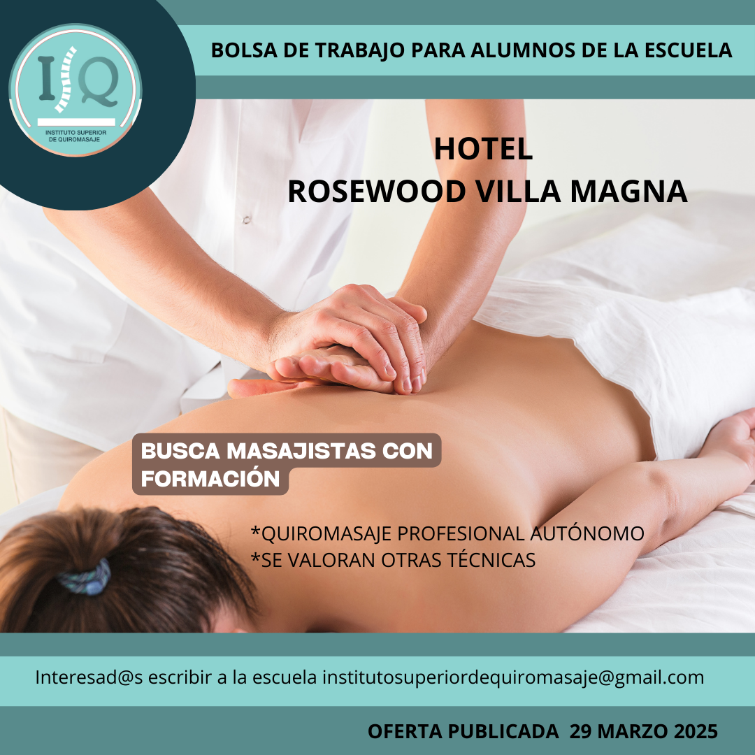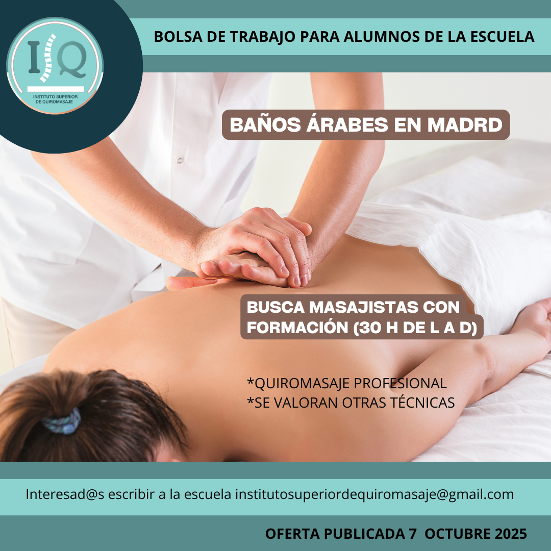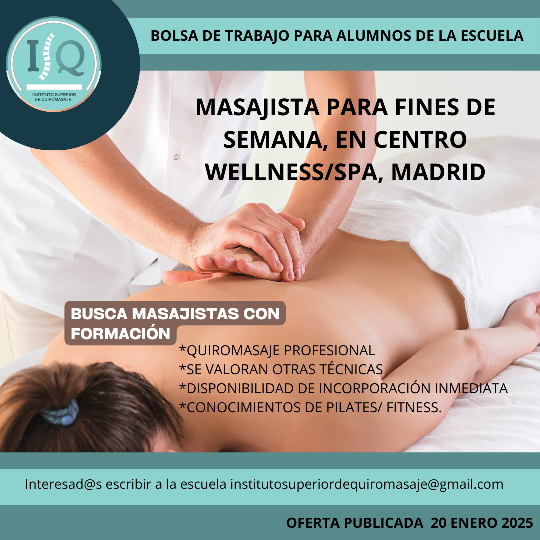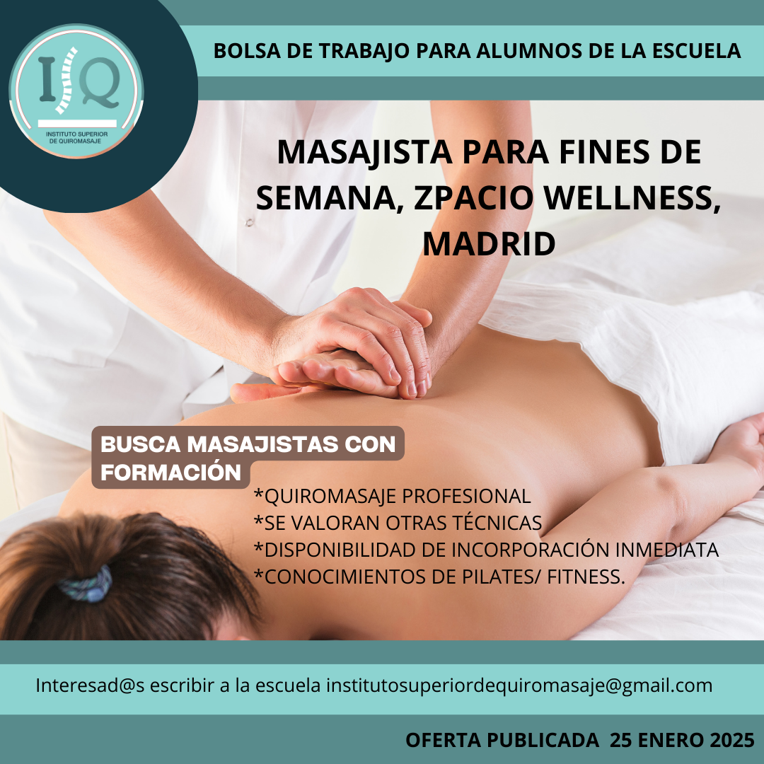Porque en el Instituto Superior de Quiromasaje no nos quedamos solo en darte una formación profesional y de calidad, queremos que nuestros alumnos impartan lo aprendido a través de nuestra bolsa de empleo. Así, si has estudiado con nosotros, ¡estás de enhorabuena!, es muy posible que tu futuro empleo este entre nuestras ofertas. Echa un vistazo y no olvides comentar en la entrevista que vas de nuestra parte.